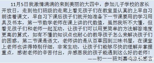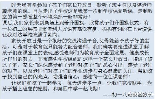课间,家长代表进入相应班级准备听课,在受到学生们热烈的欢迎后,家长代表表示感到很惊喜,同时坚信自己的孩子在大四中不仅能学到知识,还能学会修身做人。