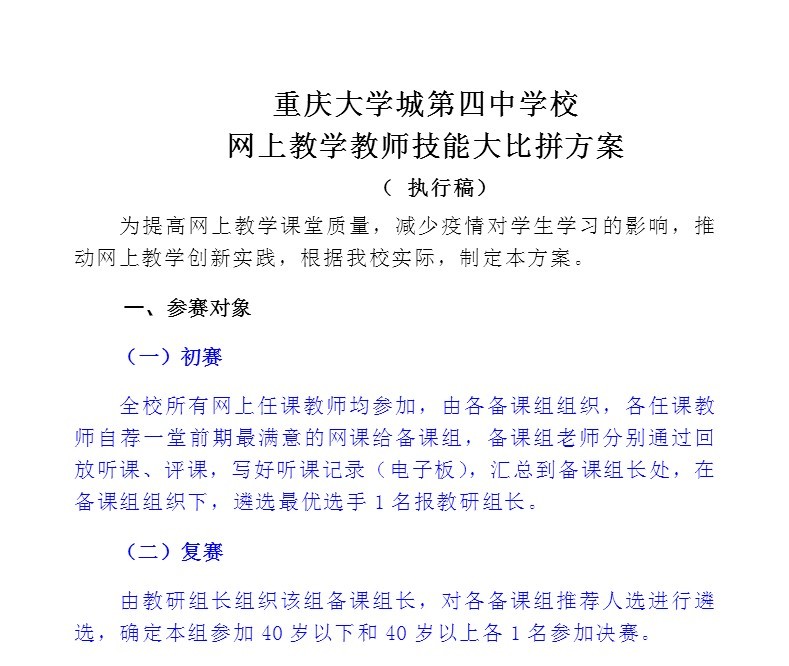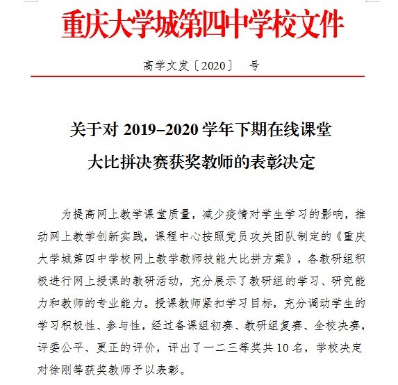 自全面打响新冠肺炎防控战役以来,大四中严格按照国家、重庆市部署,贯彻落实“停课不停学”要求,开齐开足国家课程,并结合实际,利用钉钉平台,大力实施线上教育教学,学校运转、部门配合、师生教学、防控攻坚等方面,呈现出稳中向好局面。为确保线上教学有效性,大四中精心谋划,周密研究,创造性地开展线上教学比武大赛,拉开战“疫”关键期师资培训专业成长的大幕。徐刚、陈思思老师斩获一等奖,梁谷旭、吴德明、龚道玉老师获得二等奖,杨毅、陈伦、鲁舟舟、钟达、陈勇老师收获三等奖。