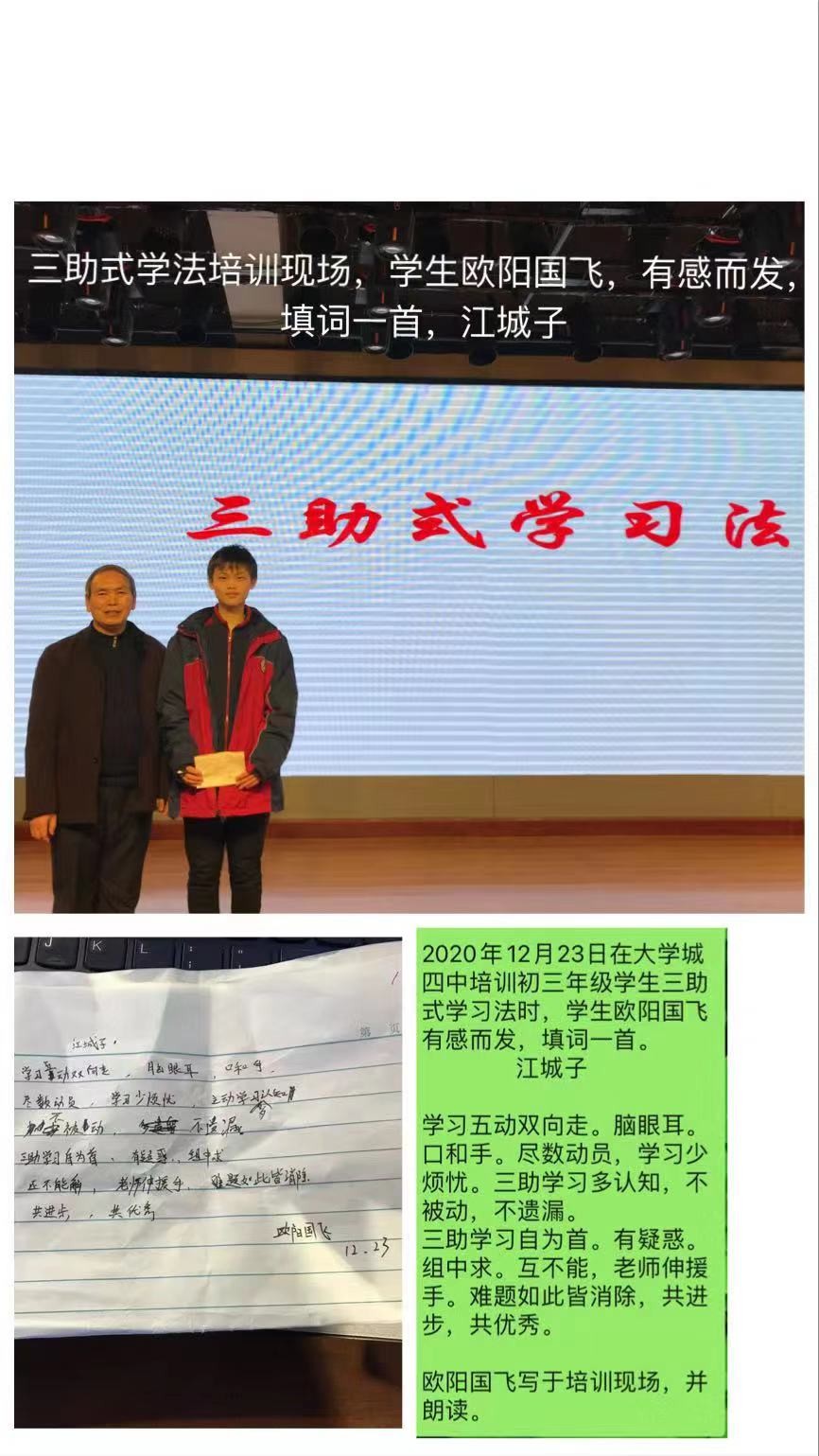 伍老师的学法指导深入浅出,简单易懂,充分激发了学生们的学习热情。同学们在伍老师的带动下踊跃发言,主动参与讨论交流,详细地记录下学习要点。大胆走上台与大家畅谈己见,正如九年级1班的叶欣同学在体验了“三助式”学习过程后写下了感想:愿“三助式”学习法做伙伴们初晨的那缕光,替他们挥去迷茫的薄雾,成就属于他们的精彩人生,九年级6班的欧阳国飞同学听完后即兴挥毫赋词,学习五动双向走,脑眼耳,口和手,尽数动员,学习少烦忧。三助学习多认知,不被动,不遗漏。三助学习自为首,有疑惑,组中求,互不能,老师伸援手。难题如此皆消除,共进步,共优秀。三助式学习法简单易行,它让学习过程轻松高效,自己将在以后的学习中积极运用,感谢伍老师的分享。