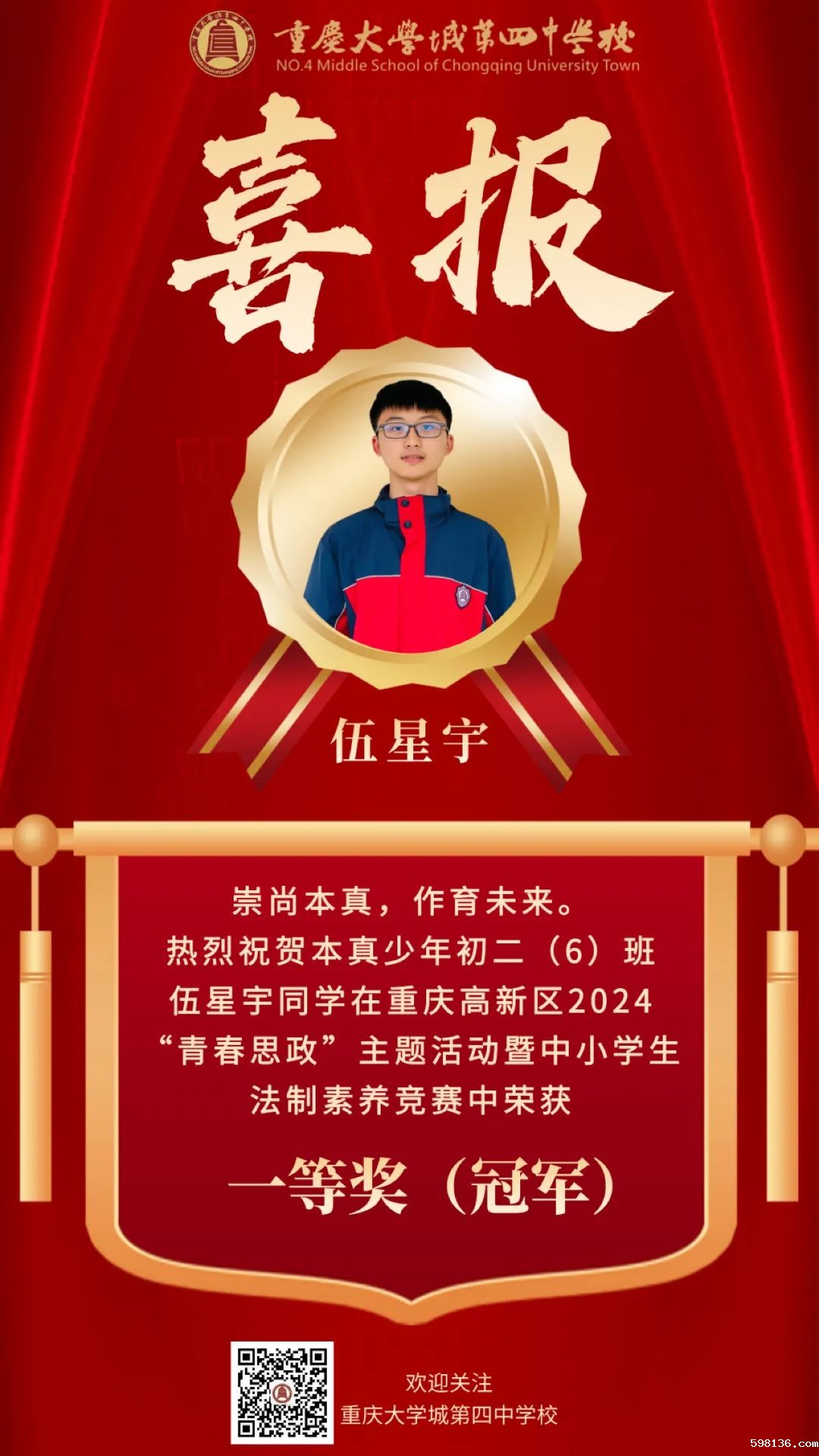 四中荣耀|热烈祝贺大四中伍星宇同学在重庆高新区2024“青春思政”主题活动暨中小学生法制素养竞赛中荣获一等奖(冠军)