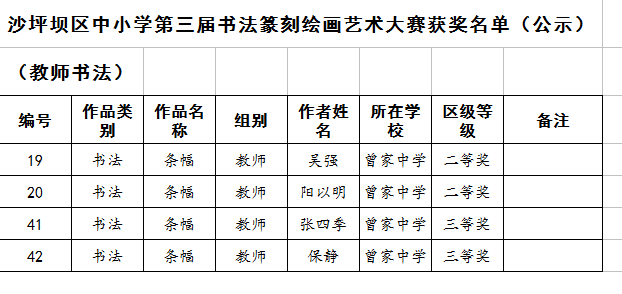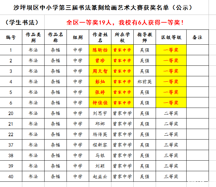 沙坪坝区中小学第三届书法篆刻绘画艺术大赛获奖名单